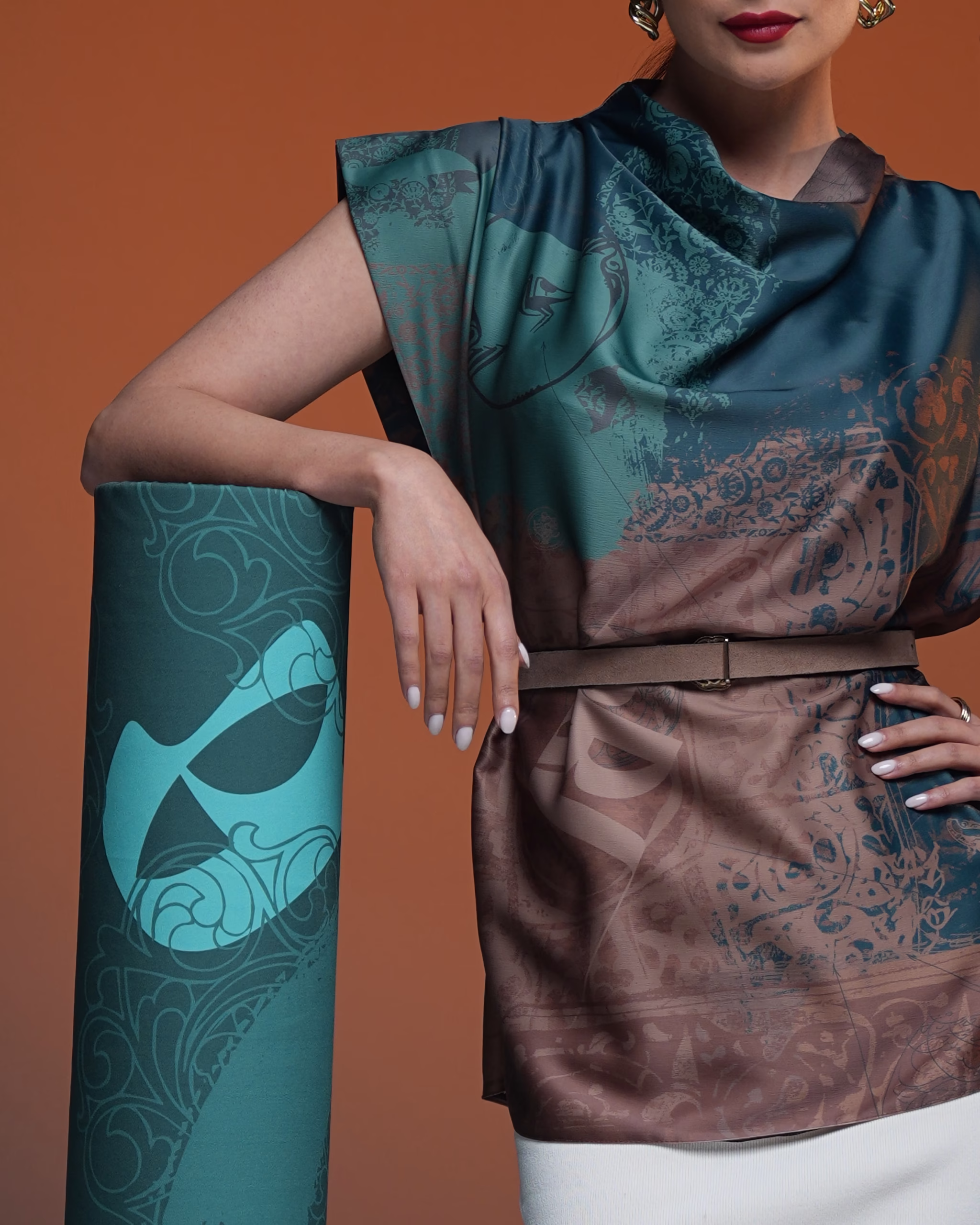 “Alchemy of the Soul,” through a composition of teal, turquoise, and earthy hues, manifests a glimpse of our inner world. Green stands for life and growth, while the earthy tone alludes to the depth and authenticity of the spirit. This garment—like the eye of the heart gazing into the world’s hidden mysteries—is an invitation to open a window onto the realm of love and its pure perceptions. “Alchemy of the Soul” is like a poem that, with calm gentleness, sings within every heart that in the dominion of love you will behold all that is unseen beauty.